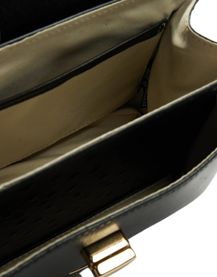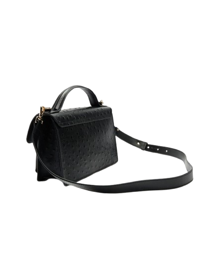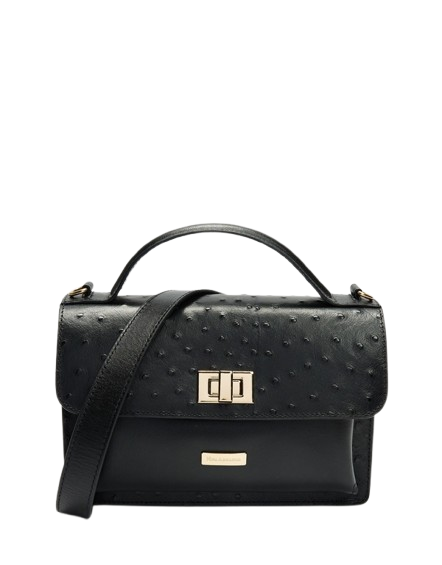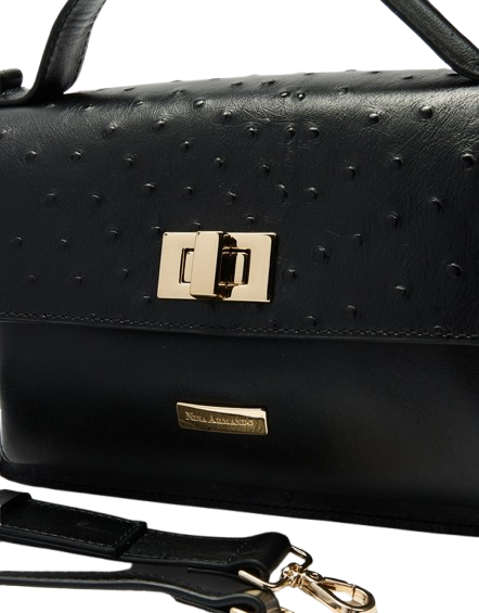 Elevate your everyday style with the BAHIA HANDBAG by Nina Armando, a timeless piece designed for modern elegance. Crafted in black Ostrich-embossed textured leather, the Bahia features a refined silhouette accented with subtle embossed detailing for a luxurious finish. The structured flap design is secured with a sleek gold-tone turn-lock closure, adding both sophistication and practicality.