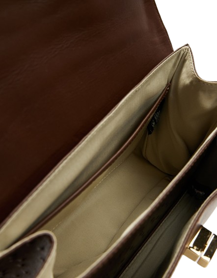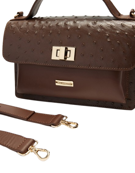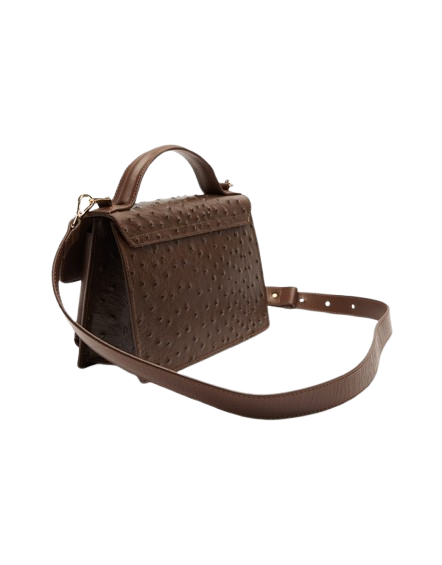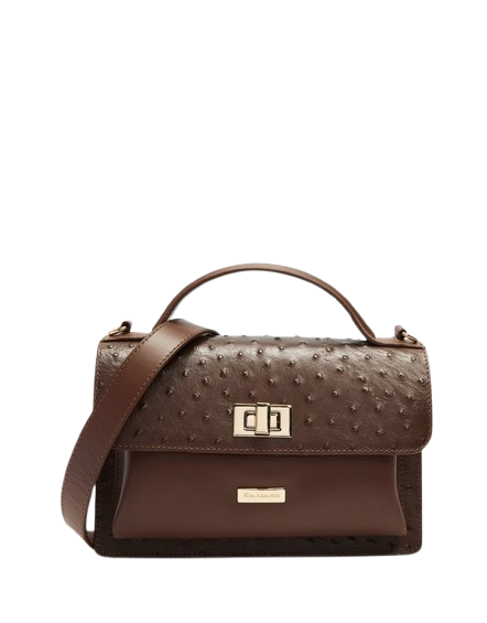 Elevate your everyday style with the BAHIA HANDBAG by Nina Armando, a timeless piece designed for modern elegance. Crafted in rich brown Ostrich-embossed textured leather, the Bahia features a refined silhouette accented with subtle embossed detailing for a luxurious finish. The structured flap design is secured with a sleek gold-tone turn-lock closure, adding both sophistication and practicality.