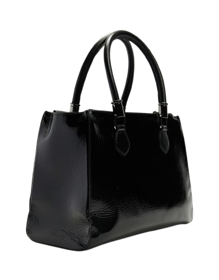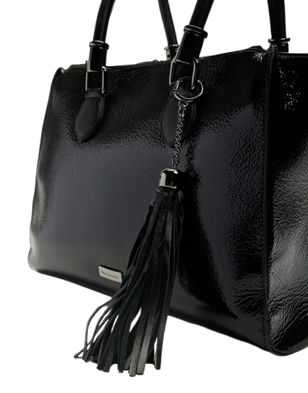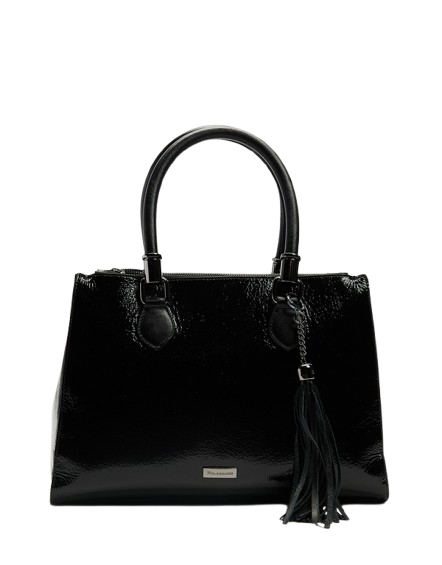 Elegant and timeless, FLORIPA HANDBAG by Nina Armando embodies sophistication in every detail. Crafted from premium patent leather, it features a structured silhouette, onyx-tone hardware, and a detachable tassel charm for a touch of effortless luxury. With spacious compartments and impeccable craftsmanship, it’s the perfect balance of style and functionality, ideal for both workdays and weekends.