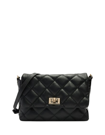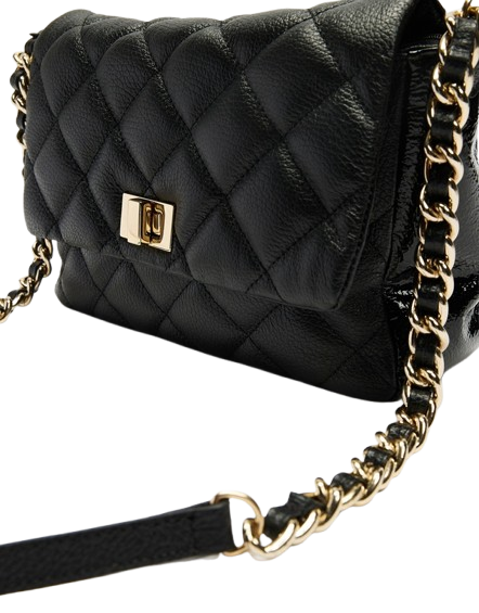 The MARAU HANDBAG by Nina Armando exudes elegance with its quilted black leather design and sleek black chain strap. Featuring a minimalist front clasp, this versatile bag adds a touch of luxury to any outfit, perfect for both day and night. A must-have for chic, modern style.